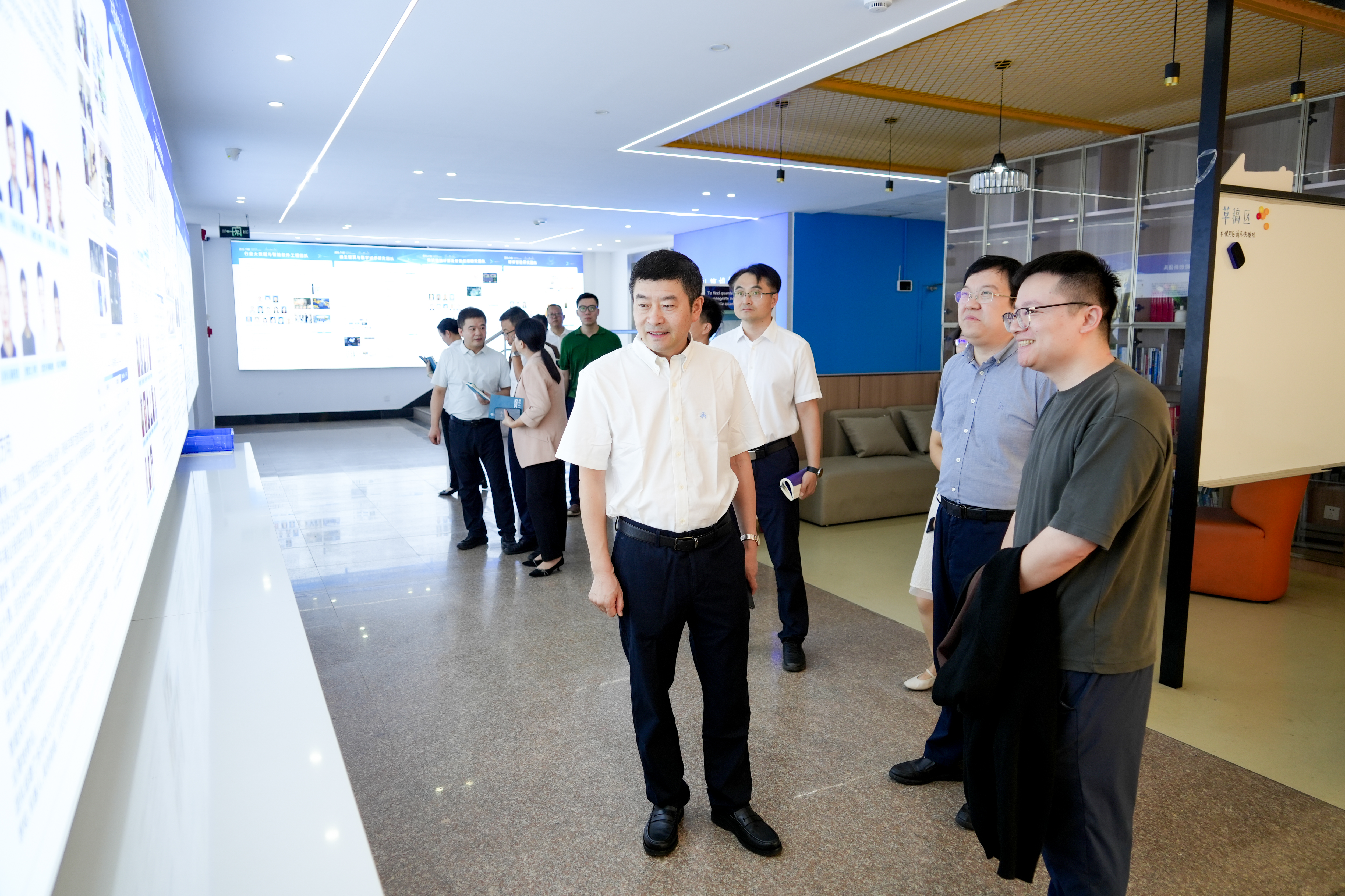 在计算机学院,王尧祥实地考察了学院党建长廊、文化空间、国家级教学示范中心,仔细听取了学院工作汇报,与学院教师代表进行了充分交流。他指出,要进一步强化标杆意识,勇挑大梁、勇担大任;要坚持实绩贡献导向,重点关注新增量与含金量;要锚定战略目标、保持战略定力,充分发挥“登峰学科”优势,更好服务国家战略与地方经济社会发展;要理清发展路径、加强过程管理,强化沟通协同,整合各方资源,形成强大合力;要加强制度保障,抓好校园安全,以高质量党建引领高质量发展。
